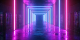 Neon lights illuminate a data server room background, glowing brightly against rows of servers and cables, creating a high-tech and futuristic atmosphere in a dark, modern environment.