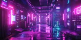 Neon lights illuminate a data server room background, glowing brightly against rows of servers and cables, creating a high-tech and futuristic atmosphere in a dark, modern environment.