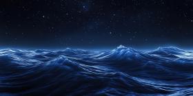 Nightscape with Smooth Undulating Blue Waves Under Starry Sky Background, Serene Ocean Waves Gently Rolling Beneath a Beautiful Starry Night Sky