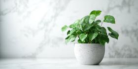 Potted Plant with Green Leaves Sits on White Marble Table Background, Fresh Green Plant on a Elegant Marble Surface in a Clean, Minimalist Setting