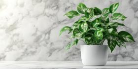 Potted Plant with Green Leaves Sits on White Marble Table Background, Fresh Green Plant on a Elegant Marble Surface in a Clean, Minimalist Setting