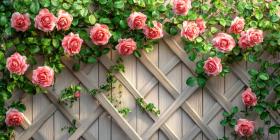 Pink roses bloom on a wooden trellis background, vibrant blossoms climbing gracefully along the rustic wooden framework, creating a charming and romantic garden scene.