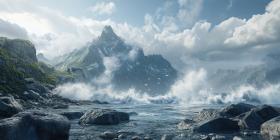 Powerful waves crashing against a rocky shore background, the ocean's force sending spray into the air as the waves pound the jagged rocks, creating a dramatic and dynamic coastal scene.