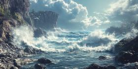 Powerful waves crashing against a rocky shore background, the ocean's force sending spray into the air as the waves pound the jagged rocks, creating a dramatic and dynamic coastal scene.