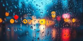 Raindrops on Glass with Blurred Lights Background, Softly Blurred Lights Creating a Dreamy Effect Through Wet Glass with Raindrops