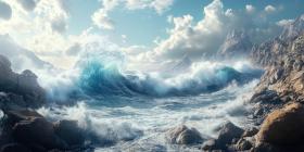 Powerful waves crashing against a rocky shore background, the ocean's force sending spray into the air as the waves pound the jagged rocks, creating a dramatic and dynamic coastal scene.