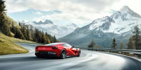 Red Sports Car Racing on Winding Mountain Road Background, Sleek Red Car Speeding Through Curved Mountain Path with Scenic Views