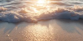 Sand and Waves Under Radiant Sunrise at Beach Background, Stunning Beach Scene with Sunrise Over Sand and Waves