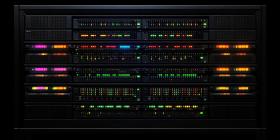 Server racks with lights background, rows of servers glowing with LED lights, creating a high-tech, modern atmosphere in a data center or server room, emphasizing the complexity and efficiency of the equipment.