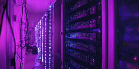 Server racks with lights background, rows of servers glowing with LED lights, creating a high-tech, modern atmosphere in a data center or server room, emphasizing the complexity and efficiency of the equipment.