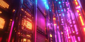 Server racks with lights background, rows of servers glowing with LED lights, creating a high-tech, modern atmosphere in a data center or server room, emphasizing the complexity and efficiency of the equipment.