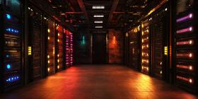 Server racks with lights background, rows of servers glowing with LED lights, creating a high-tech, modern atmosphere in a data center or server room, emphasizing the complexity and efficiency of the equipment.