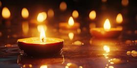 Small Happy Diwali Candles Glow Brightly Against Background, Softly Flickering Diyas with Warm Light Creating a Festive Atmosphere