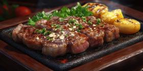 Sizzling Steak Platter with Garnishes on Hot Stone Background, Mouthwatering Steak Served on a Hot Stone with Fresh Garnishes