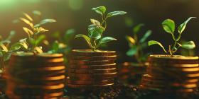 Small plants sprouting from stacks of coins background, delicate green shoots emerging from piles of shiny coins, symbolizing growth, prosperity, and financial success, set against a neutral or soft backdrop to highlight the contrast.