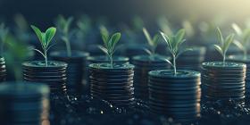 Small plants sprouting from stacks of coins background, delicate green shoots emerging from piles of shiny coins, symbolizing growth, prosperity, and financial success, set against a neutral or soft backdrop to highlight the contrast.