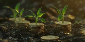 Small plants sprouting from stacks of coins background, delicate green shoots emerging from piles of shiny coins, symbolizing growth, prosperity, and financial success, set against a neutral or soft backdrop to highlight the contrast.