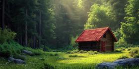 Small Wooden Cabin with Red Roof and Lush Green Forest Background, Cozy Cabin Nestled Amongst Tall Trees in a Vibrant Green Forest Setting