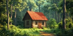Small Wooden Cabin with Red Roof and Lush Green Forest Background, Cozy Cabin Nestled Amongst Tall Trees in a Vibrant Green Forest Setting