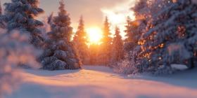 Snowy winter landscape with sunlight peeking through the trees background, soft rays of light filtering through bare branches, casting a warm glow over the serene, snow-covered ground.