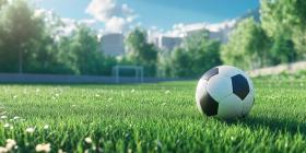 Soccer ball on green grass of stadium field background, a perfectly placed ball on the lush, well-maintained turf, with the stadium stands and a clear sky in the distance, setting the scene for a game.