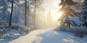 Snowy winter landscape with sunlight peeking through the trees background, soft rays of light filtering through bare branches, casting a warm glow over the serene, snow-covered ground.