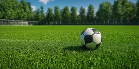 Soccer ball on green grass of stadium field background, a perfectly placed ball on the lush, well-maintained turf, with the stadium stands and a clear sky in the distance, setting the scene for a game.