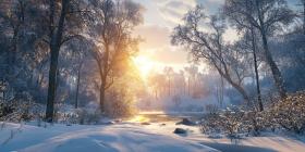 Snowy winter landscape with sunlight peeking through the trees background, soft rays of light filtering through bare branches, casting a warm glow over the serene, snow-covered ground.