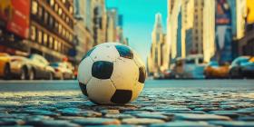 Soccer Football on Street Daylight Urban City Background, A Lively City Street with a Soccer Ball on the Ground Under Bright Daylight