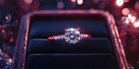 Sparkling diamond engagement ring in a velvet box background, the brilliant diamond gleaming under soft lighting, nestled in a luxurious red velvet box, evoking a sense of elegance and romance.