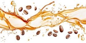 Splashing liquid coffee with floating beans background, rich coffee splashing upwards with several coffee beans suspended in mid-air, creating a dynamic and flavorful scene full of movement and energy.