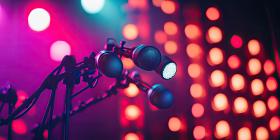 Spotlights Illuminate Colorful Backdrop of Blurred Lights Background, Vibrant Lights Blurring into a Dreamy Effect with Focused Spotlights Creating a Dramatic Scene