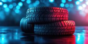 Stack of Racing Sports Car Tires with Vibrant Background, Bold Racing Tires Piled Up Against a Colorful, Energetic Backdrop