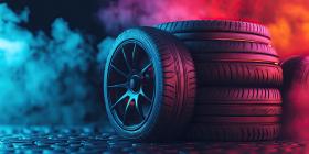 Stack of Racing Sports Car Tires with Vibrant Background, Bold Racing Tires Piled Up Against a Colorful, Energetic Backdrop
