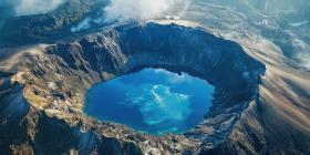 Stunning aerial view of a volcanic crater lake background, the deep blue water nestled within the jagged crater's rim, surrounded by lush greenery and rugged terrain, offering a breathtaking and dramatic landscape.