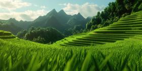 Stunning green terraced rice fields in a mountainous background, layers of lush greenery cascading down the slopes, surrounded by misty mountains and a tranquil sky.