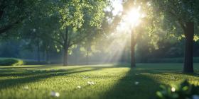 Sun shining through trees in a park background, warm rays of sunlight filtering through the branches, casting dappled shadows on the ground, creating a peaceful and inviting natural scene.