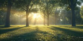 Sun shining through trees in a park background, warm rays of sunlight filtering through the branches, casting dappled shadows on the ground, creating a peaceful and inviting natural scene.