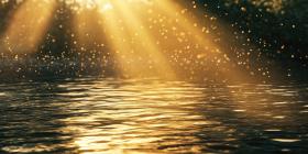 Sunlight beams through the water background, soft rays of light filtering through crystal-clear water, creating a serene and tranquil atmosphere with ripples dancing across the surface.