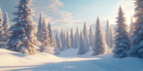 Tall pine trees covered in fresh snow background, the branches dusted with a blanket of white snow, creating a serene winter scene with a peaceful, snow-covered forest stretching into the distance.