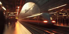 Train Speeds Through Station with Blurred People Background, Dynamic Motion of Train Passing by Busy Station with Softly Blurred Figures of Passengers