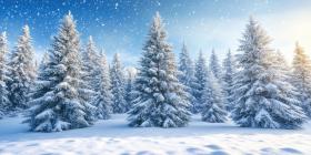 Tall pine trees covered in fresh snow background, the branches dusted with a blanket of white snow, creating a serene winter scene with a peaceful, snow-covered forest stretching into the distance.