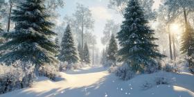 Tall pine trees covered in fresh snow background, the branches dusted with a blanket of white snow, creating a serene winter scene with a peaceful, snow-covered forest stretching into the distance.