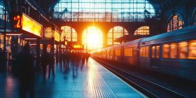 Train Speeds Through Station with Blurred People Background, Dynamic Motion of Train Passing by Busy Station with Softly Blurred Figures of Passengers