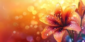 Vibrant orange lily with dew drops background, a strikingly beautiful flower with petals adorned by glistening droplets, set against a soft, natural backdrop, highlighting its elegance and freshness.