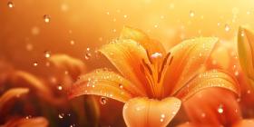 Vibrant orange lily with dew drops background, a strikingly beautiful flower with petals adorned by glistening droplets, set against a soft, natural backdrop, highlighting its elegance and freshness.