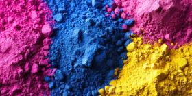 Vibrant blue, pink, and yellow pigment Holi powders background, a burst of bright colors scattered across a surface, creating a joyful and festive atmosphere, with the rich hues blending together in a playful display.