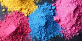 Vibrant blue, pink, and yellow pigment Holi powders background, a burst of bright colors scattered across a surface, creating a joyful and festive atmosphere, with the rich hues blending together in a playful display.