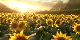 Vibrant sunflower field background, a sea of bright yellow sunflowers stretching across the landscape, their faces turned toward the sun under a clear blue sky, creating a warm and cheerful atmosphere.