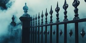 Vintage ornate iron fence with scary Halloween horror misty fog smoke background, an eerie, detailed iron fence silhouetted against a thick fog, with mist swirling around the fence, creating a spooky, chilling atmosphere perfect for a Halloween scene.